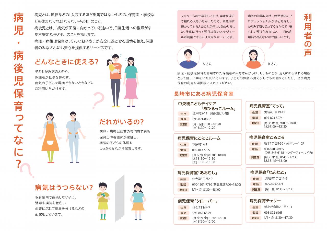 長崎市では、子育てと就労の両立支援の一環として、病気または病気の回復期にある児童を、保護者の就労等の理由により一時的に預けることが困難な場合に、専門の施設で保育を行う「病児・病後児保育事業」を市内8箇所で実施しています。