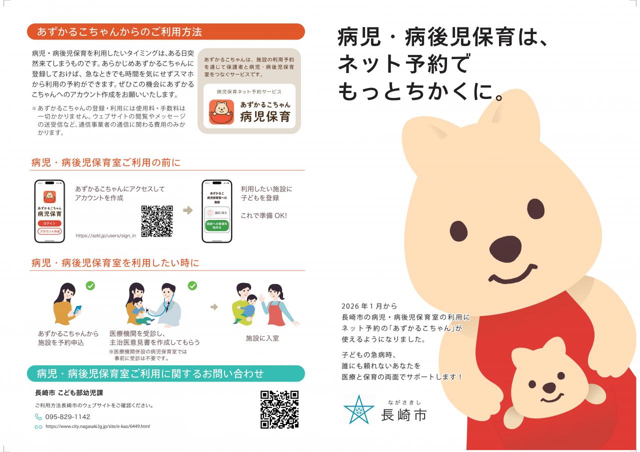 令和8年1月からは、市内全8施設の病児・病後児保育施設に予約システム「あずかるこちゃん」を導入しました!
